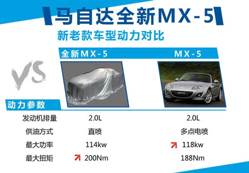 全新MX-5在動力方面搭載的是馬自達2.0L創馳藍天自然吸氣式發動機,采用了獨特的直噴供油方式,壓縮比可高達14:1,最大功率為114kw,峰值扭矩為200Nm,現款MX-5搭載的也是2.0L自然吸氣式引擎,供油方式則采用的是傳統的多點電噴,最大功率為118kw,最大扭矩為188Nm。