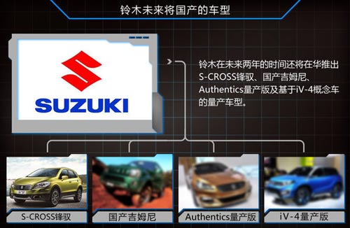 鈴木汽車10月在中國市場銷售19,184輛汽車,而去年10月份在華銷量為16,888輛,同比增長13.5%。據了解,鈴木在未來兩年的時間內,除了將推出國產吉姆尼之外還將國產多款新車,進而促進在華銷量的進一步增長。在本月的廣州車展上亮相的長安鈴木S-CROSS鋒馭將于今年12月正式上市,此外定位于緊湊級轎車的Authentics量產版將會在2014年底引入國內,而在今年的法蘭克福車展上亮相的iV-4概念車的量產版也將于2015年由長安鈴木進行國產。