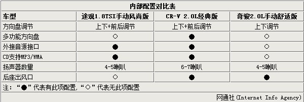 在內部配置方面,途觀1.8TSI手動風尚版和CR-V 2.0L經典版顯然優于奇駿2.0L手動舒適版,其中值得一提的是途觀和CR-V方向盤調節均為上下+前后調節,車主可根據各自實際情況進行調節;此外,CR-V在揚聲器數量上也多于途觀和奇駿,帶個車內乘員音樂上全方位的感受,更為人性化的配置是奇駿和CR-V均配備了后座出風口,這對于后排乘客來說是個不錯的配置。