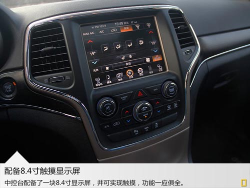 大切諾基3.0L的中控區域簡約風格,并沒有過多繁瑣設計,多個系統均分布在中央8.4英寸的液晶屏幕上。諸如ECO節能模式、泊車輔助、車輛穩定系統等常用的按鍵。