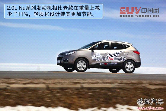 現代ix35搭載新的2.0L Nu系列和2.4L自然吸氣發動機。ix35的2.0L Nu發動機擁有121kW/6500rpm的最大功率及199Nm/4800rpm的最大扭矩;在數據上并沒有比老款提升太多,但2.0L Nu系列發動機相比老款在重量上減少了11%,輕質化設計使其更加節能。