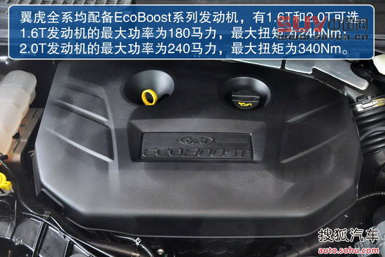 翼虎全系配備Ecoboost渦輪增壓動力,包括1.6 GTDI和2.0 GTDI兩款發動機,其最大功率分別達到了180馬力和240馬力,大幅超過其競爭對手如途觀和CR-V等車型。傳動方面全系配備了selectshift六速手自一體變速器。另外,1.6T兩款入門級車型采用前輪驅動,1.6T頂配以及2.0T車型均采用了四驅系統。