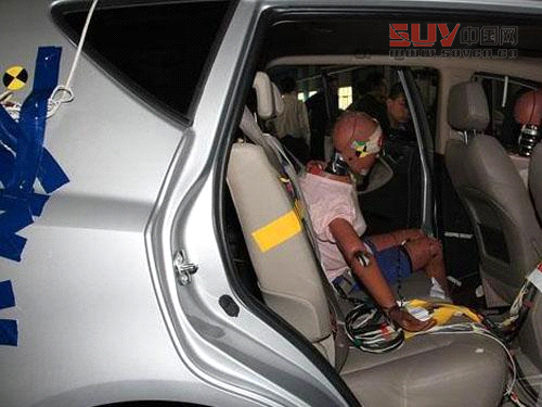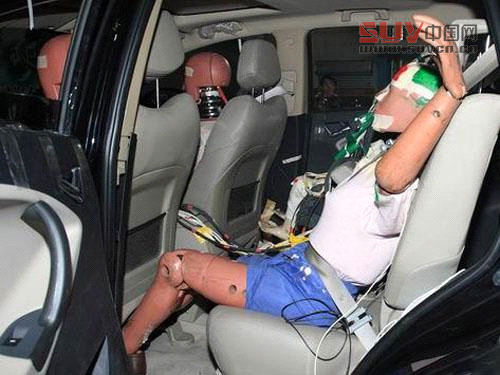 后排假人手臂上揚,安全帶未見松動。