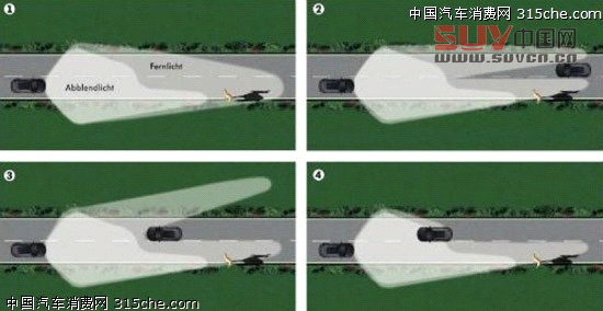2.智能隨動轉向氙氣大燈:大燈能夠自動調節偏轉,以便能夠提前照亮彎道內側盲區。開啟條件:①打開近光燈②車速>10km/h③車輛開始轉向④向前行駛。