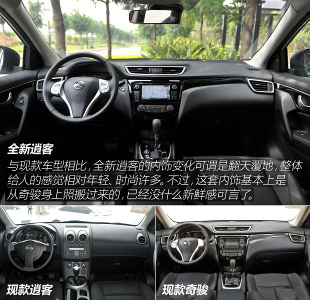 內飾方面,全新逍客和現款奇駿非常相似,整體上只有一些細節上的不同。從現有資料來看,全新逍客目前只提供深色內飾,消費者沒有什么選擇的余地。