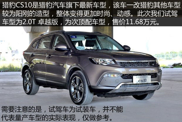 “獵豹”汽車一直以較為硬派的形象出現我們眼前,且十分低調的做事方式,讓大多數人印象最深刻的當屬基于第二代帕杰羅而來的硬派車型——黑金剛。而今天我們試駕的這款CS10就是打破這一固有印象而生的,該車有著時尚、動感的造型設計,動力方面也采用了時下流行的渦輪增壓發動機,是款純正的城市SUV車型。獵豹汽車能制造出品質不錯的硬派SUV車型,那么它所打造的城市SUV車型又會有著怎樣的表現呢?(注:試駕車輛為試裝車,并不代表量產車型的實際表現,僅供參考)