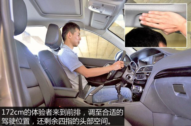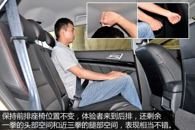 新車在車身尺寸方面相比同級別其他車型,有著一定的優勢,這讓我也很期待它在實際乘坐空間方面的表現。首先我們讓172cm的體驗坐進前排,將座椅高度調至最低,并處于一個合適的駕駛位置,頭部空間還剩余四指。之后,我們保持前排座椅位置不變,體驗者坐入后排,頭部空間和腿部空間分別剩余一拳和近三拳。另外,該車后排中間位置地板幾乎沒有凸起幅度,并且縱向距離也足夠放腳,表現相當不錯。