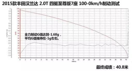 廣汽豐田漢蘭達(dá)100-0km/h制動(dòng)測(cè)試的最終成績(jī)?yōu)?0.8米,表現(xiàn)合格,雖然由于車輛自身重心高度及舒適性懸架調(diào)節(jié)等多方因素,有較為明顯的車頭下沉現(xiàn)象,但在進(jìn)行全力制動(dòng)時(shí),還是可以感受到充足的制動(dòng)力。