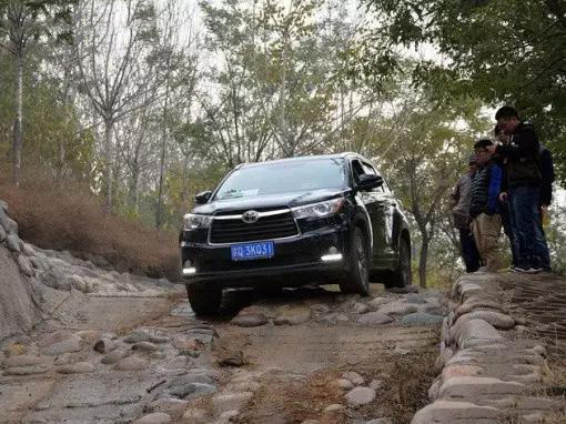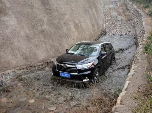 △ 廣汽豐田漢蘭達(dá)配備的四季型輪胎,在道路濕滑的路面上會(huì)稍顯不足,當(dāng)通過(guò)較大的坡度時(shí),車輛的前唇離地面的距離縮短至不足10cm。不過(guò),只要稍稍調(diào)整一下車身的角度,慢速通過(guò)不成問(wèn)題。