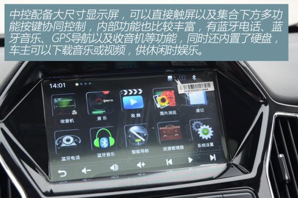 中控配備大尺寸顯示屏,可以直接觸屏以及集合下方多功能按鍵協同控制,內部功能也比較豐富,有藍牙電話、藍牙音樂、GPS導航以及收音機等功能,同時還內置了硬盤,車主可以下載音樂或視頻,供休閑時娛樂。