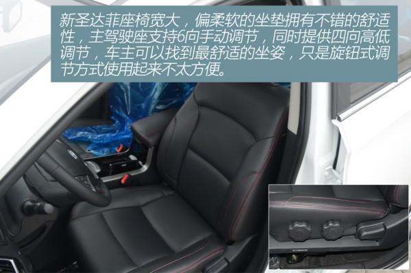 新圣達菲座椅寬大,偏柔軟的坐墊擁有不錯的舒適性,主駕駛座支持6向手動調節,同時提供四向高低調節,車主可以找到最舒適的坐姿,只是旋鈕式調節方式使用起來不太方便。