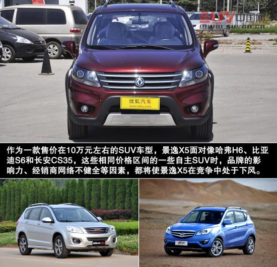 作為一款售價在10萬元左右的SUV車型,景逸X5面對像哈弗H6、比亞迪S6和長安CS35,這些相同價格區(qū)間的一些自主SUV時,品牌的影響力、經(jīng)銷商網(wǎng)絡(luò)不健全等因素都將使景逸X5在競爭中處于下風。