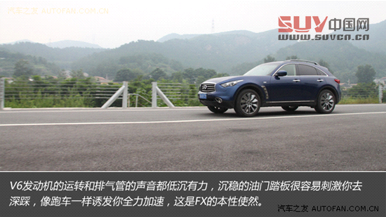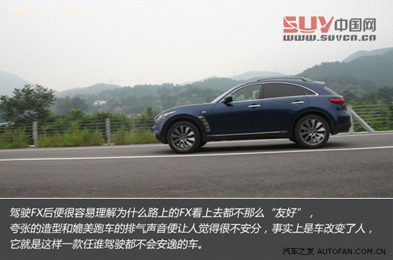 為了提供跑車版敏捷、直接的操控,英菲尼迪FX37采用了相當激進的調教方案,可能有人會覺得這樣的設定容易令人緊張,在我看來,如果你熱衷于駕駛,喜歡SUV的安全、視野和雄偉,同時又不放棄對高階駕駛體驗的追求,那么FX就是一款非常合適的車型。