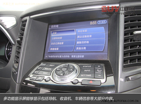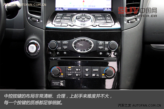 進入車內,能夠看到非常具有家族特征的整體內飾,FX37五周年限量版內飾全黑的主色調展示著它不俗的運動天賦,大量細膩的真皮材質表明這是一臺價格不菲的豪華SUV,做工也確實對得起它的身價,很難讓你挑出明顯的瑕疵,日系豪華品牌在這方面的造詣始終令人信服。