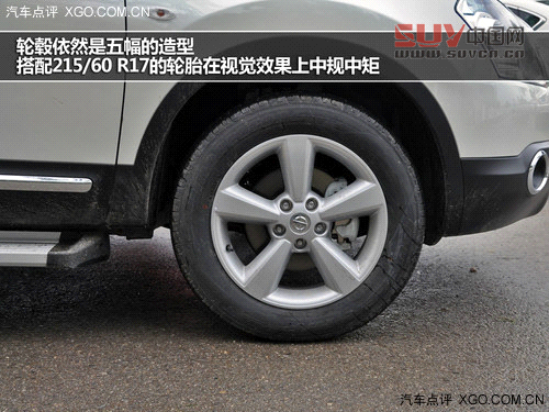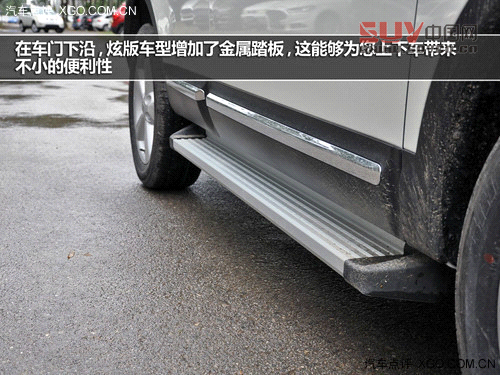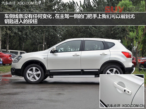車(chē)側(cè)線(xiàn)條沒(méi)有任何變化,在主駕一側(cè)的門(mén)把手上我們可以看到無(wú)鑰匙進(jìn)入的按鈕,輪轂依然是五幅的造型,搭配215/60 R17的輪胎在視覺(jué)效果上中規(guī)中矩,在車(chē)門(mén)下沿,此次推出的”炫“版車(chē)型增加了金屬踏板,這能夠?yàn)槟舷萝?chē)帶來(lái)不小的便利性,不過(guò)相應(yīng)的,在走爛路時(shí),這也會(huì)影響一定的通過(guò)性,不過(guò)像逍客這種城市SUV來(lái)講,您又有幾次會(huì)開(kāi)著它去野外撒歡呢?