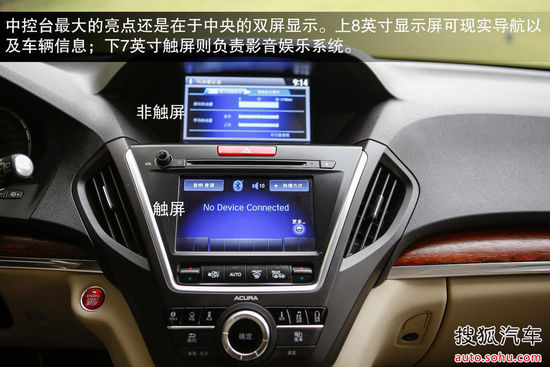 中控臺最大的亮點還是在于中央的雙屏顯示。上8英寸顯示屏可現(xiàn)實導(dǎo)航以及車輛信息;下7英寸觸屏則負(fù)責(zé)影音娛樂系統(tǒng)。全新謳歌MDX高配車型中為后排車殼提供了一個16.2英寸可分屏顯示的娛樂顯示屏。