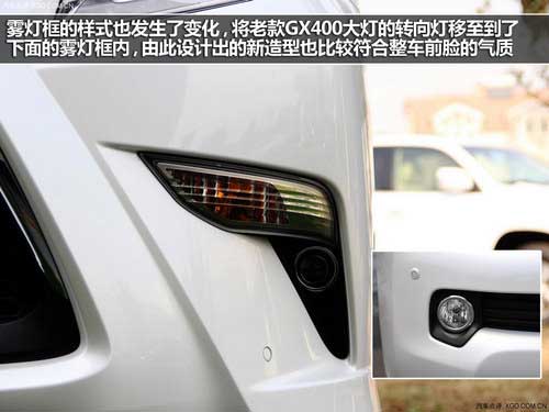 霧燈框的樣式也發生了變化,將老款GX400大燈的轉向燈移至到了下面的霧燈框內,由此設計出的新造型也比較符合整車前臉的氣質。