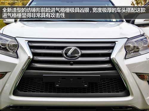 首先,我們來看看2014款雷克薩斯GX400的車頭前臉,采用全新的家族式前臉造型一改老款車型給人們的印象,前衛、冷酷的造型是我給新款GX400的評價。事實上,這么形容他一點都不夸張,霸氣的進氣格柵造型完全顛覆了老款車型的氣質。聽到不少朋友以此造型來評判自己的審美,相比之下,我是更愿意接受老款那溫順的造型。