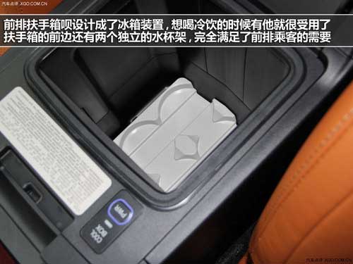 前排扶手箱唄設計成了冰箱裝置,想喝冷飲的時候有他就很受用了,扶手箱的前邊還有兩個獨立的水杯架,完全滿足了前排乘客的需要。