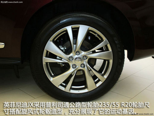 英菲尼迪JX采用普利司通公路型輪胎235/55 R20的輪胎尺寸搭配旋風(fēng)式輪轂造型,充分展現(xiàn)了它的運動基因。普利司通動力俠H/P輪胎旨在提供更為優(yōu)秀的公路操控性,對于JX35來說已經(jīng)足夠日常使用了。