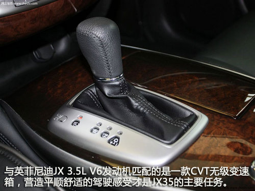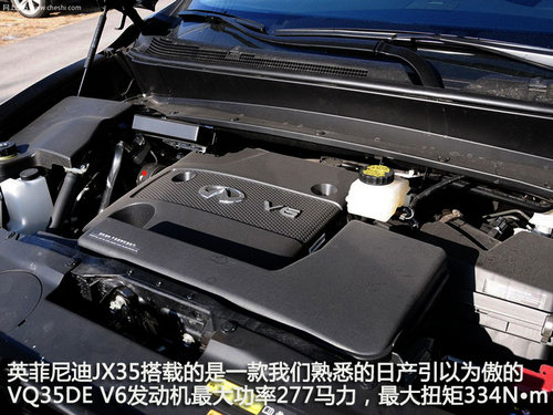 英菲尼迪JX35搭載的是一款我們熟悉的日產(chǎn)引以為傲的VQ35DE V6發(fā)動機,最大功率277馬力,最大扭矩334N•m。從數(shù)據(jù)來看,這款發(fā)動機如今已經(jīng)表現(xiàn)平平,不過它的平順性以及穩(wěn)定性還是非常值得稱道的。