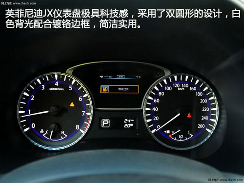 英菲尼迪JX儀表盤極具科技感,采用了雙圓形的設(shè)計,白色背光配合鍍鉻邊框,簡潔實用。在中間還配有一塊行車電腦液晶顯示屏,車輛行駛信息顯示更為直觀清晰。