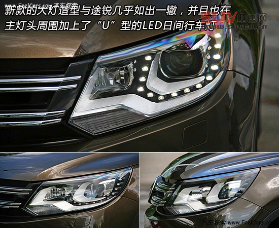 說到像途銳,當然首先是前大燈的變化,原來老款的大燈組造型略顯秀氣,而新款的大燈造型與途銳幾乎如出一轍,并且也在主燈頭周圍加上了"U"型的LED日間行車燈。