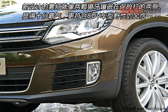 然后就是進氣口兩側(cè)霧燈的位置,面積加大,并且舍棄了圓形霧燈,采用豎裝的霧燈,就像兩顆獠牙鑲嵌在保險杠的兩側(cè)。這樣一來,新途觀的前臉顯得十分霸氣,更符合SUV車型野性的風(fēng)格。