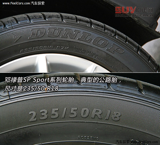 新款車型的18寸輪轂非常漂亮,配備鄧祿普SP Sport系列輪胎,這是典型的公路胎,也說明途觀更注重的是公路性能。輪胎尺寸是235/50 R18。