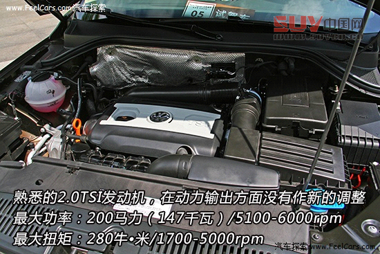 打開發(fā)動機艙,便可以看到那臺熟悉的2.0TSI發(fā)動機,在動力輸出方面沒有作新的調(diào)整,依然是最大200匹馬力(147千瓦),在5100-6000的轉(zhuǎn)速爆發(fā);最大扭矩同樣是280牛•米,扭矩平臺轉(zhuǎn)速范圍非常廣——1700-5000轉(zhuǎn)每分。