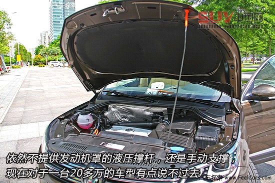 很可惜,新途觀上依然不提供發(fā)動機罩的液壓撐桿,還是手動支撐,現(xiàn)在對于一臺20多萬的車型有點說不過去。
