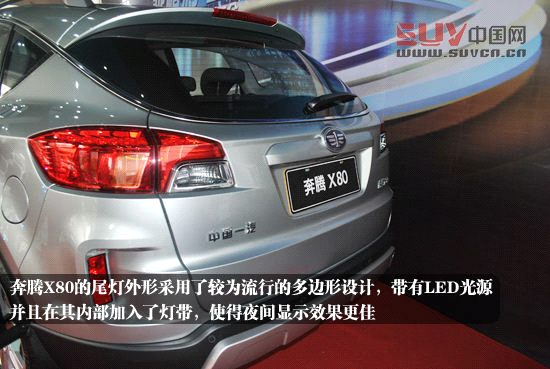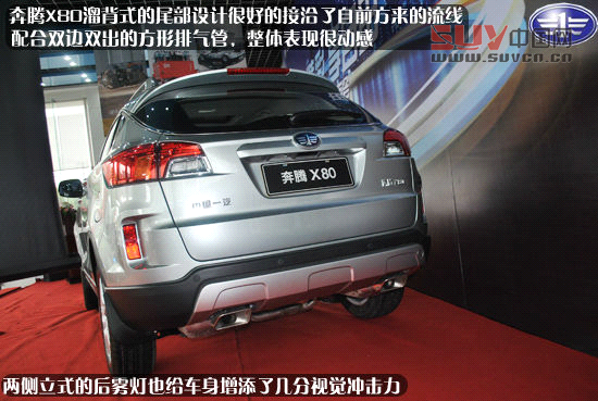 奔騰X80尾部設(shè)計比較獨(dú)特,配合雙邊雙出的方形排氣管,整體表現(xiàn)很動感。