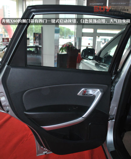 奔騰X80的側(cè)門帶有四門一鍵式啟動按鈕,白色裝飾點(diǎn)綴,大氣且實用。