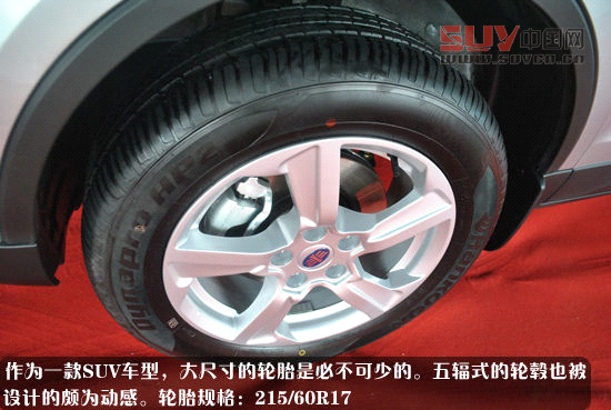 作為一款SUV車型,大尺寸的輪胎是必不可少的。五輻式的輪轂也被設(shè)計的頗為動感。輪胎規(guī)格:215/60R17。