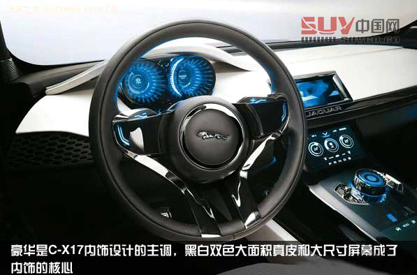 豪華是C-X17內(nèi)飾設(shè)計(jì)的主調(diào),黑白雙色大面積真皮和大尺寸屏幕成了內(nèi)飾的核心,以此營造一種豪華和智能感。四個(gè)賽車座椅和這個(gè)SUV體格形成的反差,鋼琴黑中控臺(tái)可以充當(dāng)觸摸屏操控各種設(shè)備,提供多種信息,頭頂?shù)娜疤齑翱雌饋砭拖袷且粋€(gè)百葉窗,但它可以調(diào)整透光度。