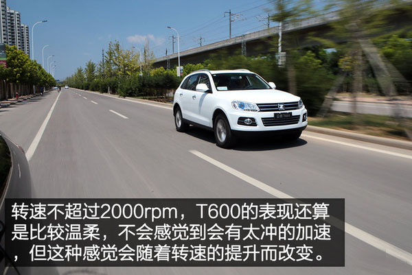 不過當轉速超過2000rpm之后,渦輪開始進入工作狀態,這時T600的潛力好像也被瞬間喚醒一般,一改之前懈怠之態,油門與發動機之間的匹配度順暢、積極了許多,動力輸出也有著非常顯著的提升,急加速時動力的傳遞更能跟得上駕駛者的節奏,也更有激情,這種更為強烈、有勁兒的提速催促感絕對可以滿足絕大部分人的超車需求。不過一般小排量渦輪發動機在后段會有動力下滑,但是讓我沒有想到的是T600上這臺1.5T發動機在高轉速時還能有讓人滿意的動力迸發,即便轉速高達5000rpm時,就算收油然后再踩油門,還可以感覺到車身會有小幅的前竄。