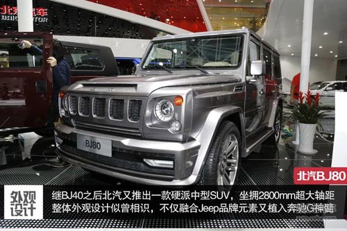 BJ80是繼北京40車型之后,北京汽車推出的又一款硬派SUV車型,擁有2800mm的軸距,并將搭載4.0L發動機,同時擁有出色的四驅性能,整體設計融合了奔馳G系的元素,十分具有看點。