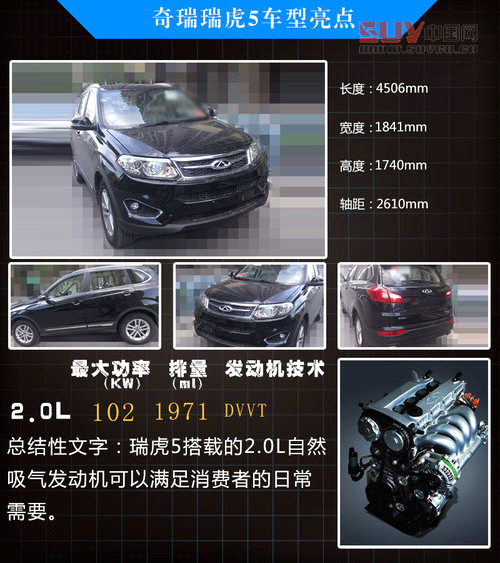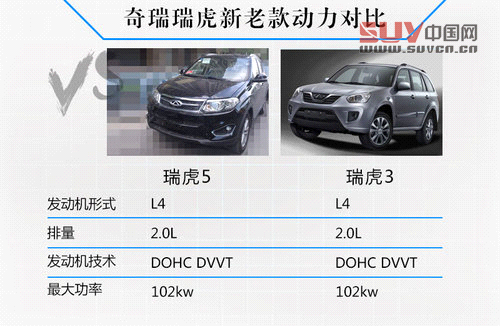 奇瑞瑞虎5和瑞虎3車型都搭載了直列四缸2.0L自然吸氣發(fā)動機,發(fā)動機都使用的是DOHC DVVT技術(shù)。在最大輸出功率方面也基本和現(xiàn)款車型保持一致,達到102kw。