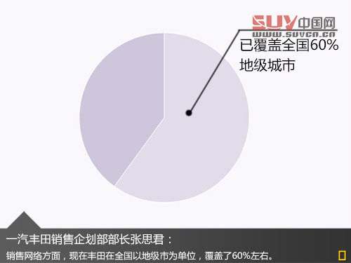 全新車型推出的同時,對于渠道的拓展一汽豐田張思君此前曾在接受媒體采訪時表示:現在我們一汽豐田已經正式開業的4S店共有467家(截至7月12日,長春車展),另外還有97家分店已經開業,而近年來我們無論是4S店還是分店,主要的還是瞄準三四級(城市)甚至是更小的一些市場。此外張思君還介紹到:“從開業的角度來講,現在豐田在全國以地級市為單位,覆蓋了60%左右。”