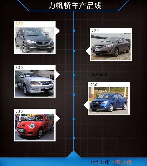 2013年10月,力帆汽車于西藏齊發三款全新車型,分別為330、530、630三款轎車,而根據其品牌規劃,力帆還將于明年推出兩款全新車型。對此,力帆汽車銷售有限公司常務副總經理楊國華在接受媒體采訪時表示:“明年有一款X50的跨界車將推出,另外還有一款基于全新平臺打造的轎車820,也是明年會推出。總體來講,按照目前力帆的規劃來說,就是每年至少要推出兩款全新的產品。”