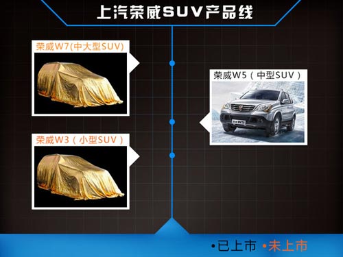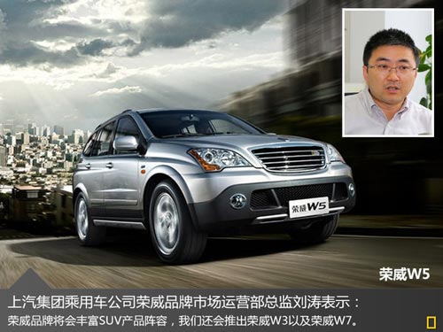 上汽集團旗下榮威品牌目前主要以銷售350、550、750等轎車為主,在SUV領域其只有一款中型SUV-W5,然而隨著近年來國內SUV市場銷量的迅速增長,僅靠一款單一產品已落后于競爭對手的腳步。針對SUV領域目前產品較為單一的局面,上汽集團乘用車公司榮威品牌市場運營部總監(jiān)劉濤在接受記者采訪時表示:“榮威品牌未來將會豐富SUV產品陣容,我們還會推出榮威W3以及榮威W7。”從命名上來看,榮威W3定位為小型SUV,而W7定位為中大型SUV,兩款新車推出后將分別競爭福特翼搏和豐田漢蘭達等。