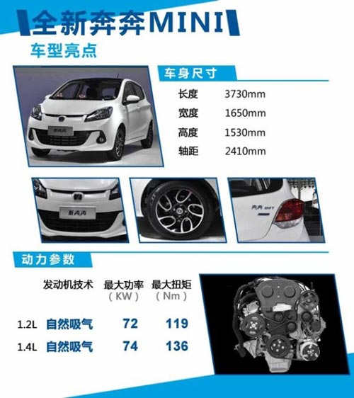 奔奔MINI作為長安自主品牌旗下定位在微型車市場的主要車型之一,全新車型的長/寬/高分別為3700mm/1650mm/1530mm,軸距2410mm,相較現款車型增加了65mm。動力方面,全新奔奔MINI將為消費者提供1.2L和1.4L兩款自然吸氣引擎。其中1.2L發動機最大功率72kW,最大扭矩119Nm,與目前該車型采用的1.0L發動機,在動力數值上分別提升了21kw和20Nm,此外排量更大1.4L引擎,將為全新奔奔MINI帶來更為出色的動力表現。