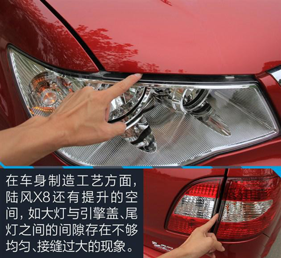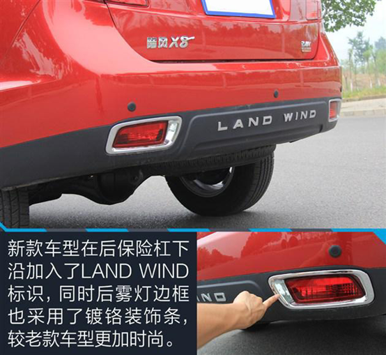 此次改款的陸風(fēng)X8調(diào)整了霧燈造型并新增了LED日間行車燈,同時在尾部保險杠下沿加入了LAND WIND標識。除了這類細節(jié)方面的修改外,新款X8在外觀方面基本與老款車型保持一致,相比于其他品牌在車型改款時對外觀進行大刀闊斧的改動,陸風(fēng)X8的改款稍顯保守。