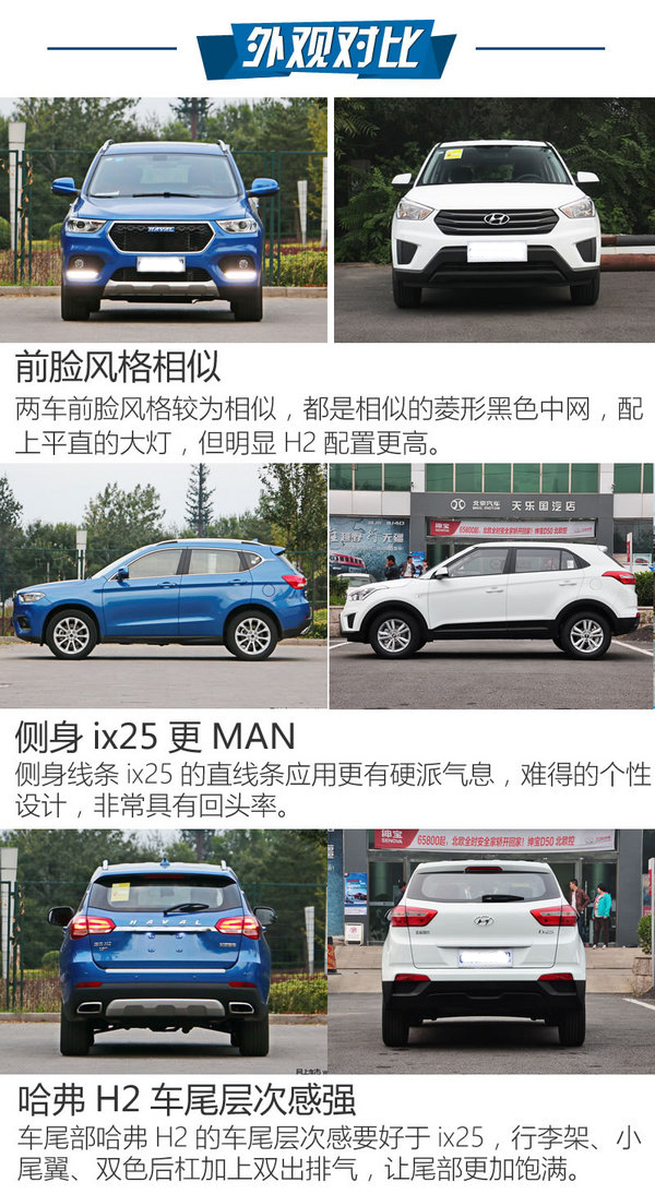 對比的兩款車選擇都是12萬左右的車款,H2可以買到頂配而ix25只能買到最低配,而且從市場價格來看,兩車的優惠幅度也很相似,所以,用低配比頂配自然配置上是輸的很慘,而且空間H2也要更大,除了做工更細致外觀更個性外,我當然是推薦購買H2藍標版。