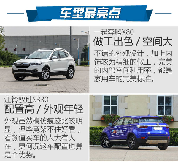 對比的兩款車型是高配車型,從市場價格來看,兩款車雖然相差不多,但馭勝S330要比X80多了一套四驅系統,不帶四驅系統的版本要比對手便宜一萬多,并且配置還要高,單奔騰X80的品質確實要更好一些,綜合來說,確實勢均力敵,這個決定真的要靠眼緣了。