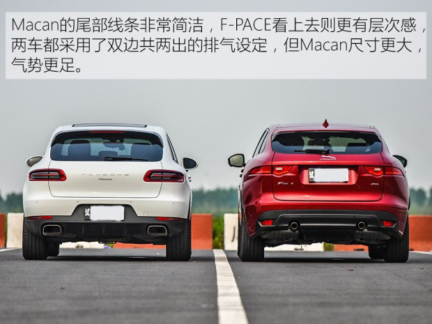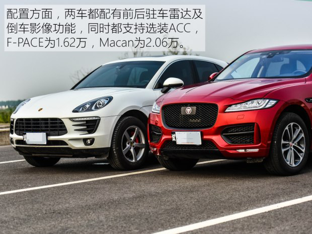 此次我們測試的兩款車型依次為2016款 捷豹F-PACE 2.0T 兩驅(qū)R-Sport運動版、2016款 Macan 2.0T,以下分別簡稱:“F-PACE”、“Macan”。這兩款車的指導(dǎo)價格分別為62.80萬、55.80萬,有著一定的差距,但如果算上市場優(yōu)惠及選裝件的價格,這兩款車的終端售價還是非常接近的。