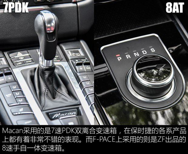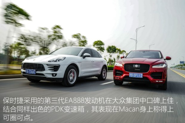 看完了靜態(tài)部分,接下來我們看看兩車的動力配備,無論是Macan還是F-PACE的入門車型都搭載了一臺2.0T四缸渦輪增壓發(fā)動機。保時捷這邊,Macan的發(fā)動機是我們熟悉的大眾集團第三代EA888發(fā)動機,最大功率252馬力(185千瓦)/5000-6800rpm,最大扭矩370牛·米/1500-4500rpm,這個參數(shù)要比采用同款發(fā)動機的Q5高不少。變速箱依舊是保時捷自家的PDK雙離合,一共7個前進擋位,公認的雙離合變速箱里數(shù)一數(shù)二的優(yōu)秀產(chǎn)品。