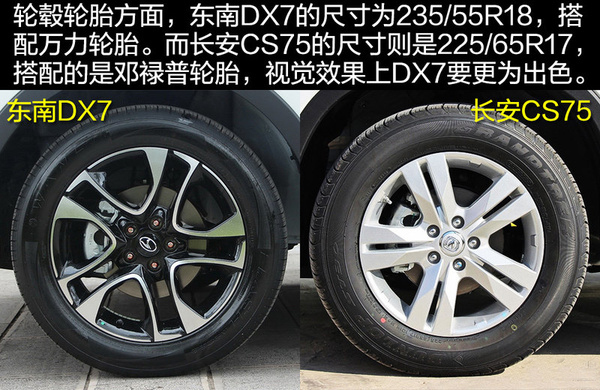 輪胎輪轂方面,雖然DX7配備了18寸的輪轂,但是匹配的萬力輪胎顯得要比CS75的稍遜色一點,不過大尺寸的輪轂在視覺上效果很不錯。