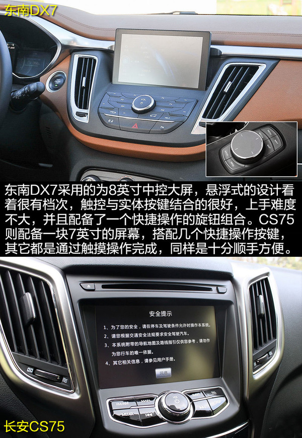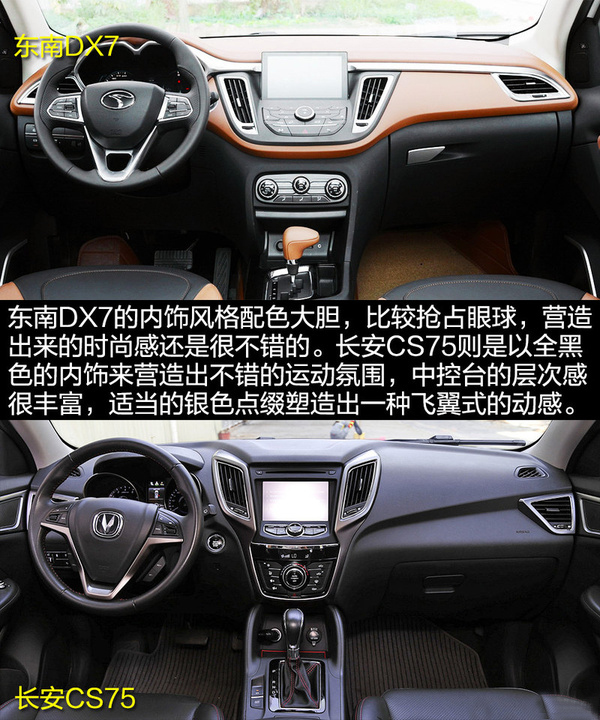 內(nèi)飾方面,東南DX7完全是一派活潑的年輕氣息,雙色的中控看上去挺有質(zhì)感。而長安CS75則是強調(diào)全黑色的運動氣息,在方向盤的縫線等處均低調(diào)地透露出了其特性。