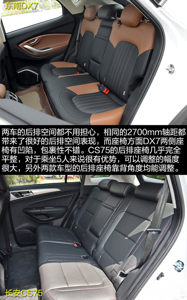 前排的空間就不多說了,對于大家最為關(guān)注的后排空間,DX7和CS75都能夠交出讓人滿意的答卷,絕對夠用。
